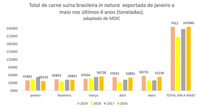 Evento previsto desde o início do ano, principalmente após o surto de Peste Suína Africana que ocorreu na China, as exportações de carne suína no Brasil têm sido crescentes. Dados do Ministério da Indústria, Comércio Exterior e Serviços (MDIC) indicam que a exportação da proteína in natura apresentou um salto nos meses de abril e maio de 2019, totalizando 247,4 mil toneladas no acumulado do ano. Segundo a Associação Brasileira de Proteína Animal (ABPA), o total exportado até maio de 2019, incluindo carne processada, chegou a 282,9 mil toneladas, volume 16,3% superior ao mesmo período de 2018. Esse é o registro mais próximo do recorde, que ocorreu em 2016, quando houve o embarque de mais 630 mil toneladas de carne suína.
