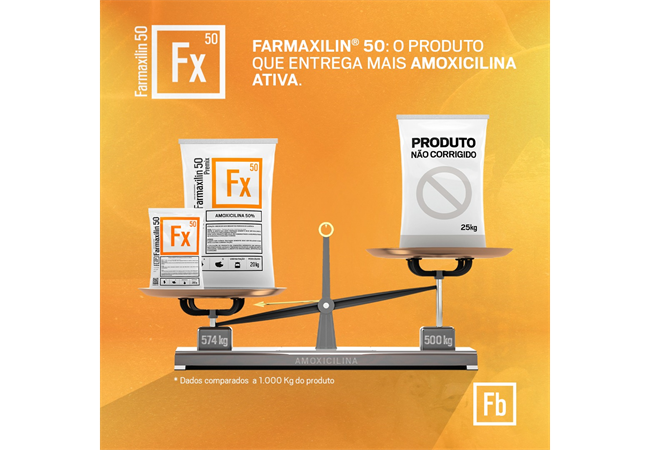 O Farmaxilin® tem 50% de amoxicilina ativa, e para atingir essa concentração, a Farmabase utiliza 57,40% de amoxicilina tri-hidratada na formulação.