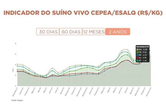 Gráfico 1. Evolução do preço do suíno vivo, em cinco estados (MG, SP, PR, RS e SC), nos últimos 2 anos (até 14/11/19), mostrando que o segundo semestre tem tendência de alta, atingindo os mesmos patamares de preço recorde de junho e julho/19, principalmente com a manutenção de altos volumes de exportação e a aproximação das datas festivas de final de ano. Fonte: CEPEA.