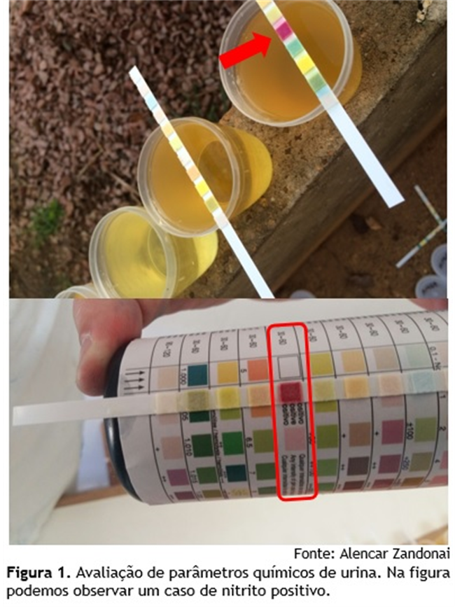 Tendo em vista a importância da ocorrência infecção urinária nos planteis comerciais de suínos, essa doença precisa ser monitorada e mensurada constantemente. Para que isso ocorra, se faz necessária a coleta da primeira (1ª) urina da manhã, antes do arraçoamento, principalmente, de fêmeas com idade de gestação ente 70 e 110 dias. O número de amostras coletadas depende do número de matrizes da granja. Os primeiros jatos de urina devem ser descartados com o objetivo de evitar contaminação com matéria orgânica. As amostras devem ser analisadas com o auxilio de fitas reativas quanto aos parâmetros químicos, como presença de nitrito, sangue, proteína, densidade e pH. Os parâmetros físicos, como o aspecto e a coloração da urina, podem ser avaliados visualmente. Cada parâmetro químico-físico representa uma informação importante para a granja e pode servir para tomada de decisão.
