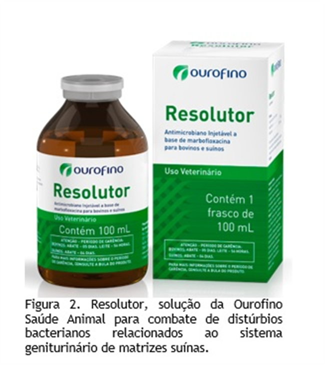 Com o objetivo de auxiliar o suinocultor no controle de doenças relacionadas ao aparelho geniturinário, a Ourofino Saúde Animal dispõe de uma potente ferramenta, o Resolutor. O Resolutor é indicado para o tratamento de desordens geniturinárias como: cistites, corrimentos vulvares de origem infecciosa e Síndrome MMA (metrite, mastite e agalactia). O Resolutor é composto por 20% de marbofloxacina, um potente antimicrobiano de amplo espectro de ação, pertencente ao grupo das quinolonas de 2ª geração, também conhecidas como fluorquinolonas. Através da Inibição da síntese da enzima DNA Girase das Bactérias, o Resolutor impede a síntese proteica bacteriana, causando a morte bacteriana. Por este motivo o Resolutor possui efeito bactericida.