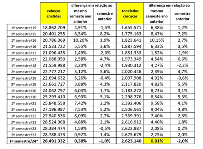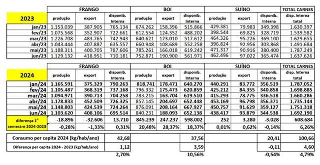 Tabela 1. Produção brasileira, exportação e disponibilidade interna mensais (em toneladas) das três carnes no primeiro semestre de 2023 e 2024.