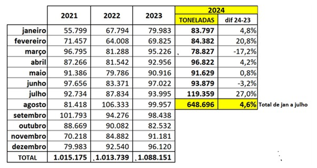 Tabela 4. Volumes exportados de carne suína brasileira in natura (em toneladas), mês a mês, em 2021, 2022, 2023 e 2024 e comparativo percentual de 2024 (de janeiro a julho) com o mesmo período do ano passado.