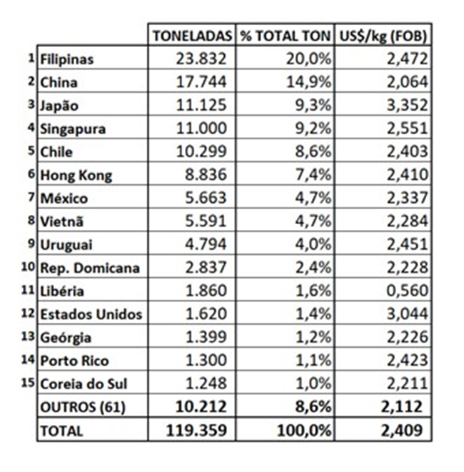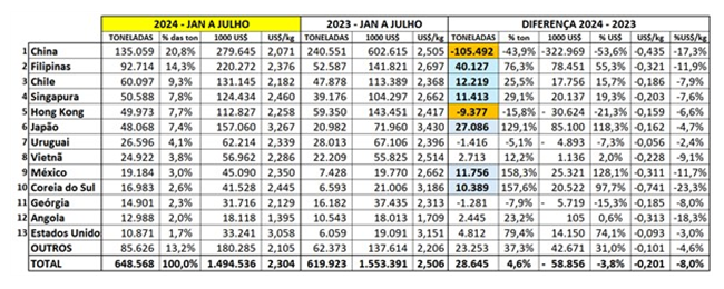 Tabela 5. Principais destinos da carne suína brasileira in natura exportada entre JANEIRO E JULHO de 2024, comparado com o mesmo período de 2023, com valor em dólar (FOB).