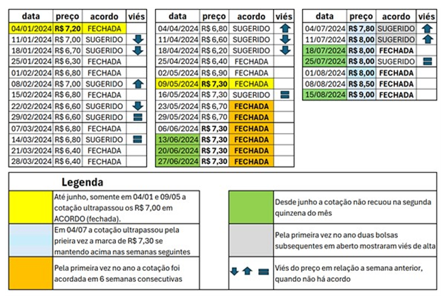 Tabela 7. Preço da Bolsa de suínos Belo Horizonte (BSEMG) em cada semana do ano de 2024 (R$/kg vivo). Na legenda (cores) é possível verificar o destaque para alguns movimentos relevantes do mercado de suíno vivo