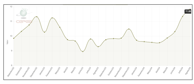 Todo este cenário de exportações em alta e redução de oferta no mercado doméstico coincidiu com a alta significativa das cotações do suíno vivo (tabela 7) e das carcaças (gráfico 1) no mesmo período. Decorrida mais da metade do mês de agosto/24, observa-se que os preços continuam em viés de alta (tabela 7).