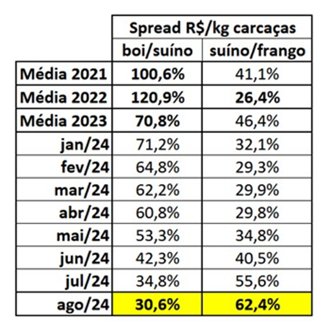 Tabela 8. Spread em porcento (R$/kg de carcaça) do boi em relação ao suíno e do suíno em relação ao frango resfriado em São Paulo em 2021, 2022, 2023 e de janeiro a agosto de 2024.