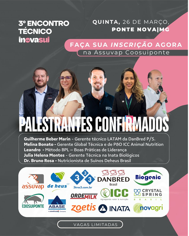 No dia 26 de março acontecerá o 3º Encontro Técnico em Inovasuí, reunindo profissionais de referência para compartilhar conhecimento, prática e inovação voltados à suinocultura.